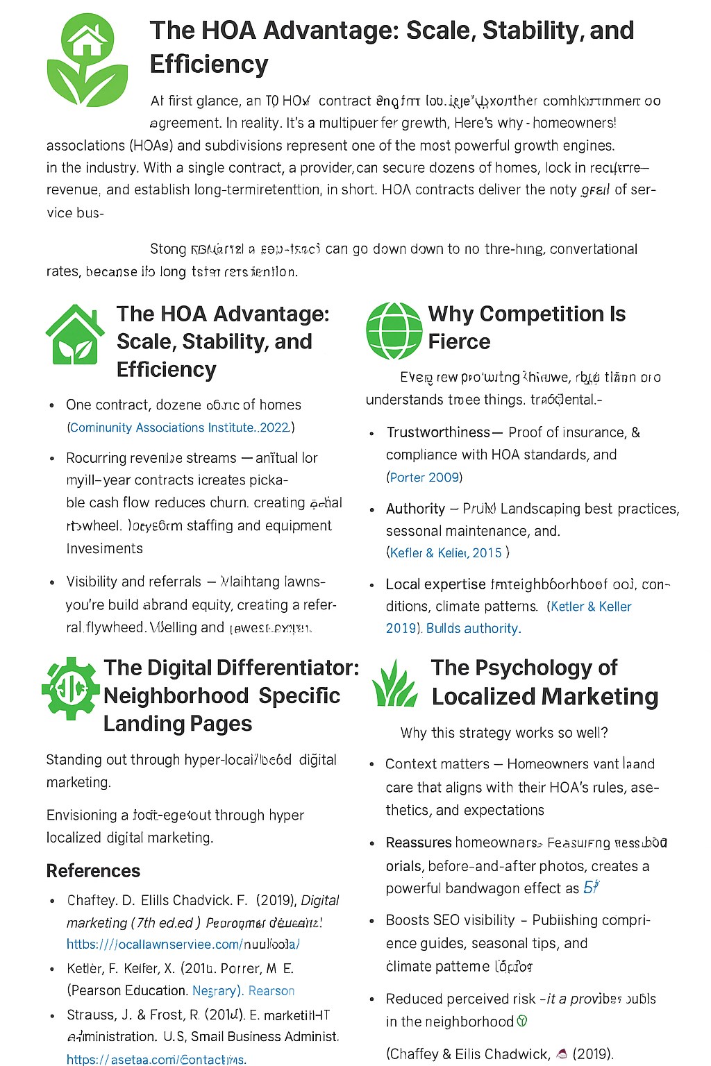But here’s the catch: competition is fierce. Every lawn pro in town knows the value of HOA contracts, and boards are notoriously selective. To win, providers must go beyond price. They must demonstrate trust, authority, and local expertise—qualities that reassure both HOA boards and individual homeowners that they’re making the right choice (Marketing Management Principles, Kotler & Keller, 2016).